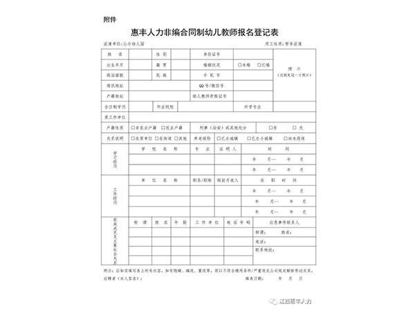為滿足我市公辦幼兒園師資需求,我公司面向社會公開招聘一大批非事業編合同制幼兒教師,以勞務派遣的方式與用人單位進行勞動力資源開發合作。現將有關事項公告如下:一、招聘人數及崗位我市招聘非事業編合同制幼兒教師50名,具體崗位在選崗前公示。二、招聘方式通過第三方勞務公...